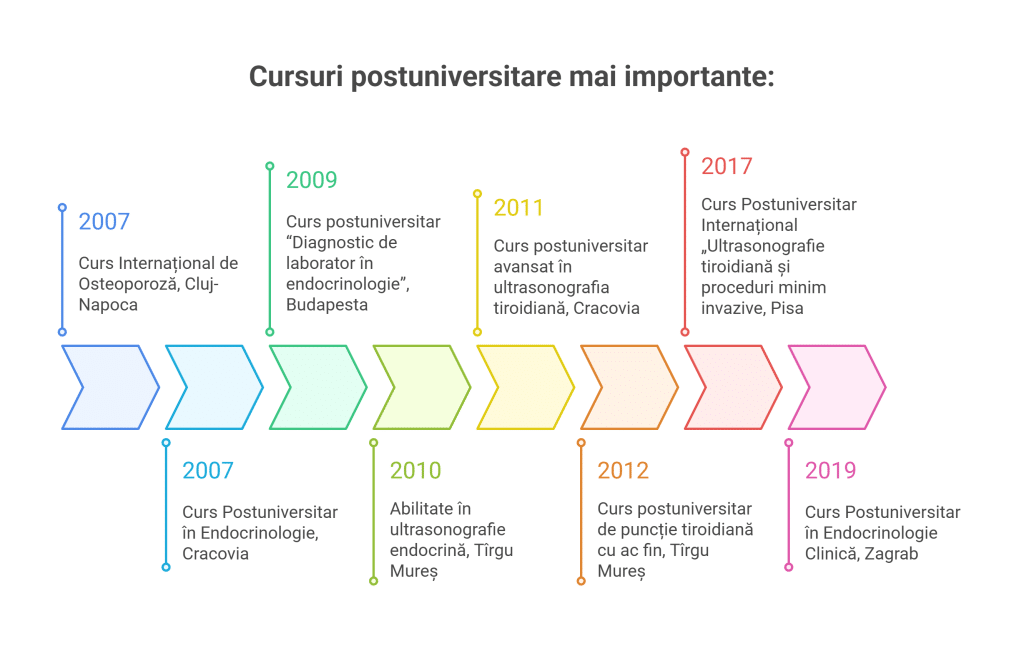 - Perfecționări: cursuri internaționale și naționale în osteoporoză, endocrinologie clinică, ecografie tiroidiană/paratiroidiană/mamară, puncție tiroidiană, proceduri minim invazive.